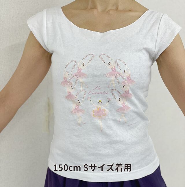 大きく開いた首元と短めの袖、切りっぱなしの袖と裾が特徴のレディース用Tシャツです。体にフィットする細身のシルエットでレオタードの上からも身体のラインがわかり、大変人気の商品です。