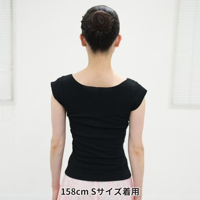 大きく開いた首元と短めの袖、切りっぱなしの袖と裾が特徴のレディース用Tシャツです。体にフィットする細身のシルエットでレオタードの上からも身体のラインがわかり、大変人気の商品です。